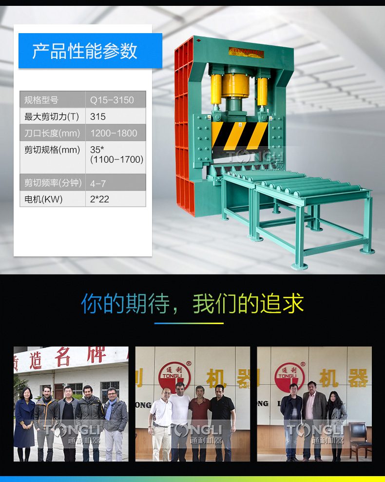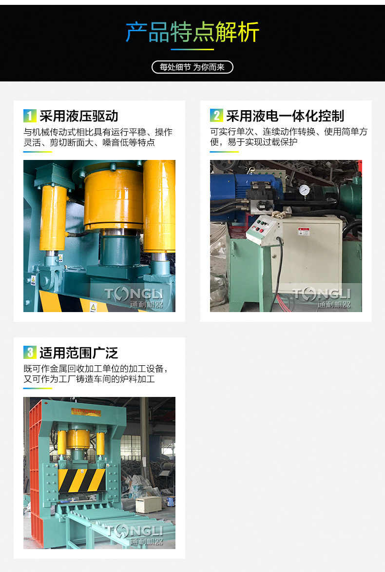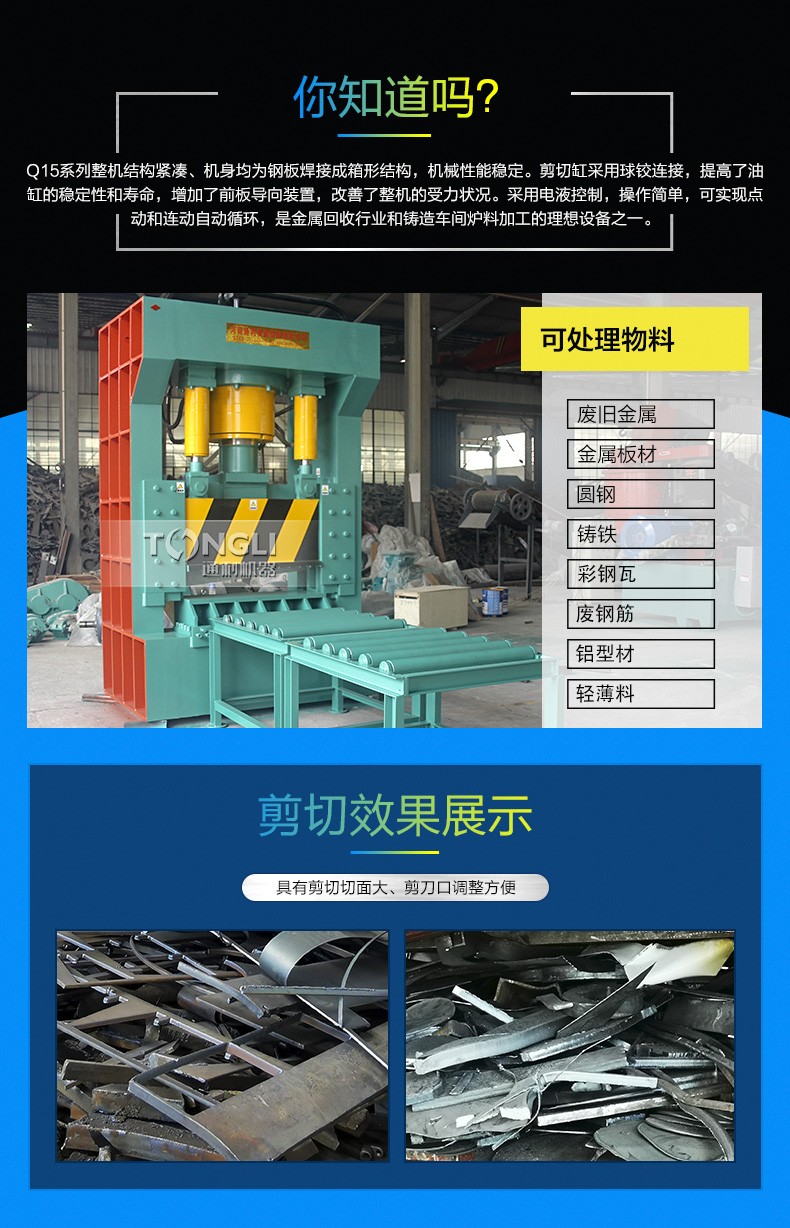 整機結(jié)構(gòu)緊湊、機身均為鋼板焊接成箱形結(jié)構(gòu),機械性能穩(wěn)定。剪切缸采用球鉸連接,提了油缸的穩(wěn)定性和壽命,增加了前板導(dǎo)向裝置,改善了整機的受力狀況。采用電液控制,操作簡單,可實現(xiàn)點動和連動自動循環(huán),是金屬回收行業(yè)和鑄造車間爐料加工的設(shè)備之一。