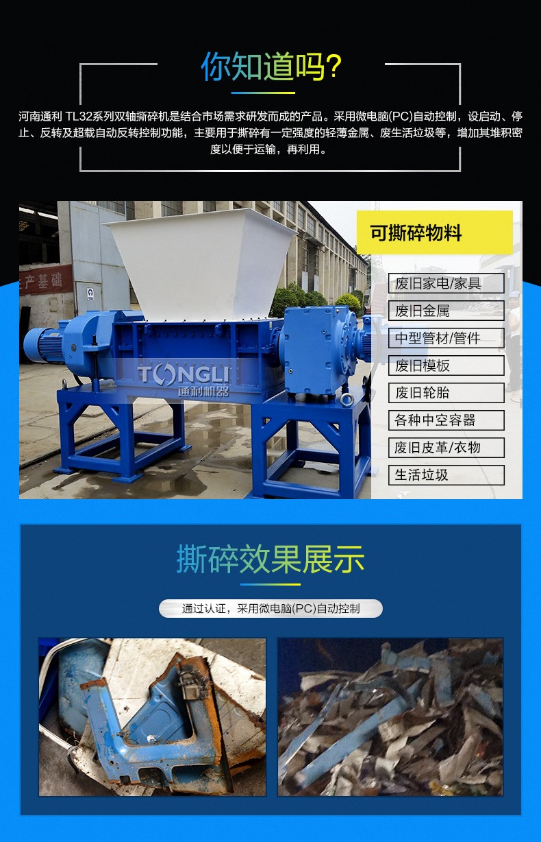 雙軸撕碎機(jī)是結(jié)合市場(chǎng)需求而成的產(chǎn)品。采用微電腦(PC)自動(dòng)控制,設(shè)啟動(dòng)、停止、反轉(zhuǎn)及載自動(dòng)反轉(zhuǎn)控制功能,主要用于撕碎有一定強(qiáng)度的輕薄金屬、廢生活垃圾等,增加其堆積密度以便于運(yùn)輸,再利用。