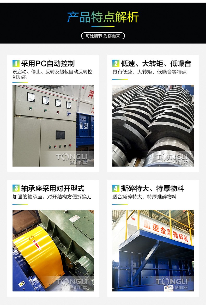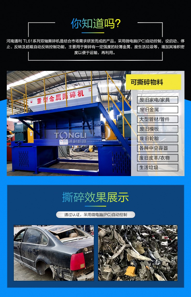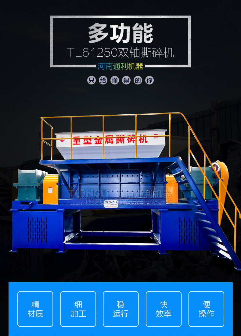 雙軸撕碎機是結合市場需求而成的產品。采用微電腦(PC)自動控制,設啟動、停止、反轉及載自動反轉控制功能,主要用于撕碎有一定強度的輕薄金屬、廢生活垃圾等,增加其堆積密度以便于運輸,再利用。