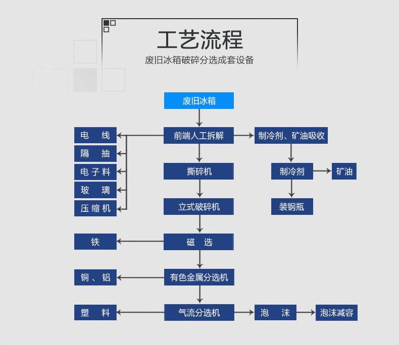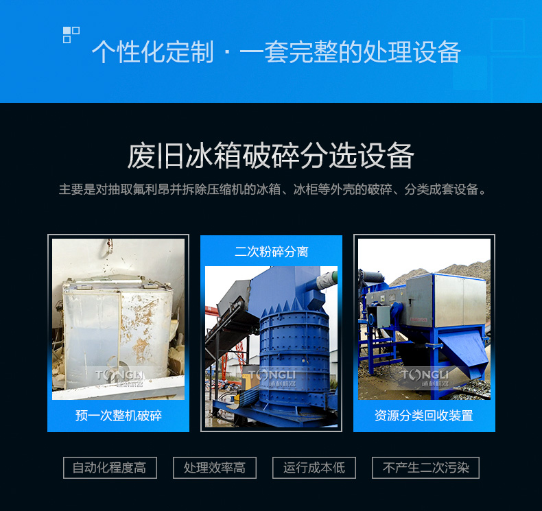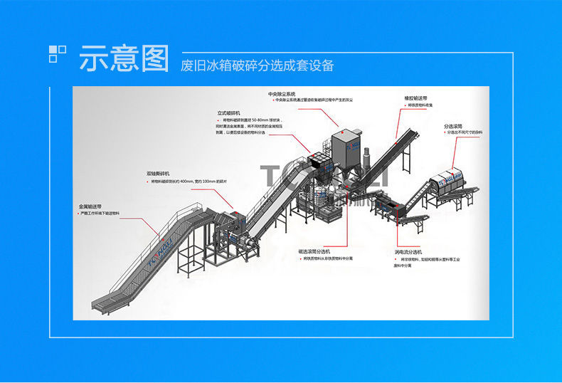 本生產(chǎn)線由重型金屬撕碎機(jī)進(jìn)行粗碎,然后經(jīng)過立式破碎機(jī)進(jìn)行破碎細(xì)化處理。再粉碎過程中采用除塵系統(tǒng)對(duì)處理過程中產(chǎn)生的粉塵進(jìn)行凈化。經(jīng)過處理的物料通過磁、渦電流、氣流等分設(shè)備,分離出來銅、鐵、鋁等可循環(huán)利用的冶煉原料。本系統(tǒng)由PLC控制,操作靈活簡便,具有能耗低、處理量、經(jīng)濟(jì)效益,維護(hù)成本低、處理效果等特點(diǎn)。