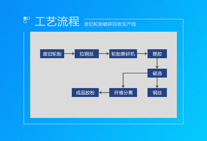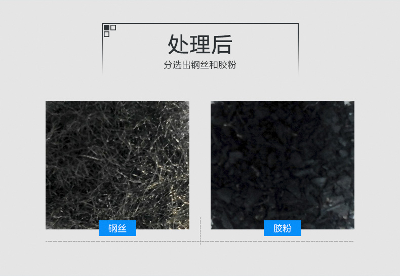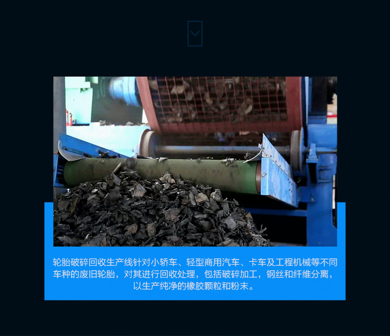 輪胎通過剔除纖維和金屬成分,經(jīng)研磨篩分而得到膠粉。再生膠粉廣泛應(yīng)用于體育場、防水卷材,公路改性瀝青,橡膠制品等領(lǐng)域。