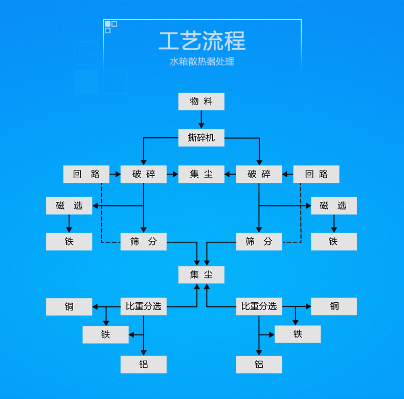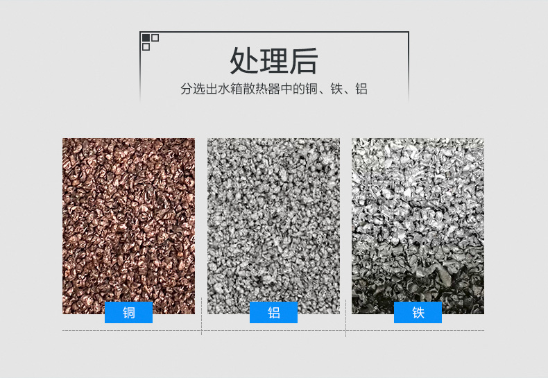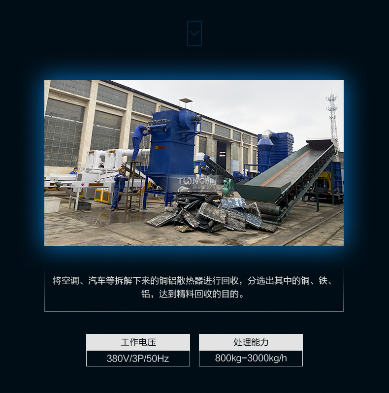 將空調(diào)﹑汽車等拆解下來的銅鋁散熱器進行回收,分出其中的銅﹑鐵﹑鋁,達到料回收的目的。